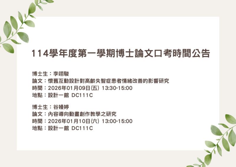 114學年度第一學期博士論文口考時間公告 歡迎旁聽