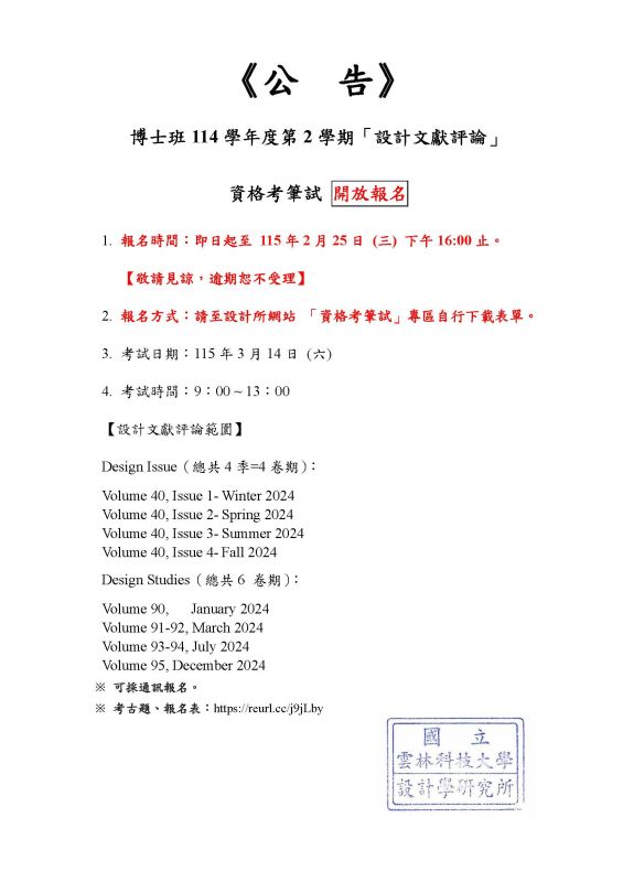 博士班114學年度第2學期 設計文獻評論 資格考筆試開放報名