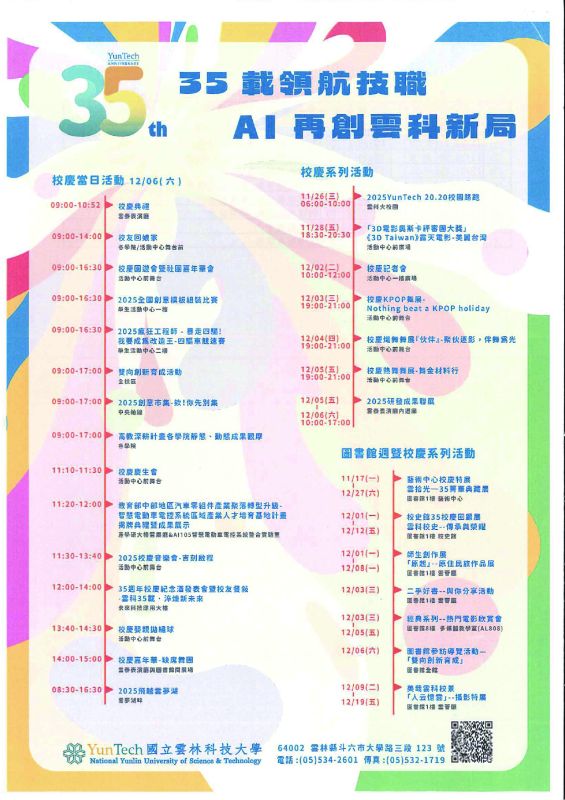 一、本年度適逢第35週年校慶,本年度校慶各項系列活動包含(一)校慶當日活動。(二)校慶系列活動。(三)圖書館週校慶系列活動。(四)校慶週系列活動。